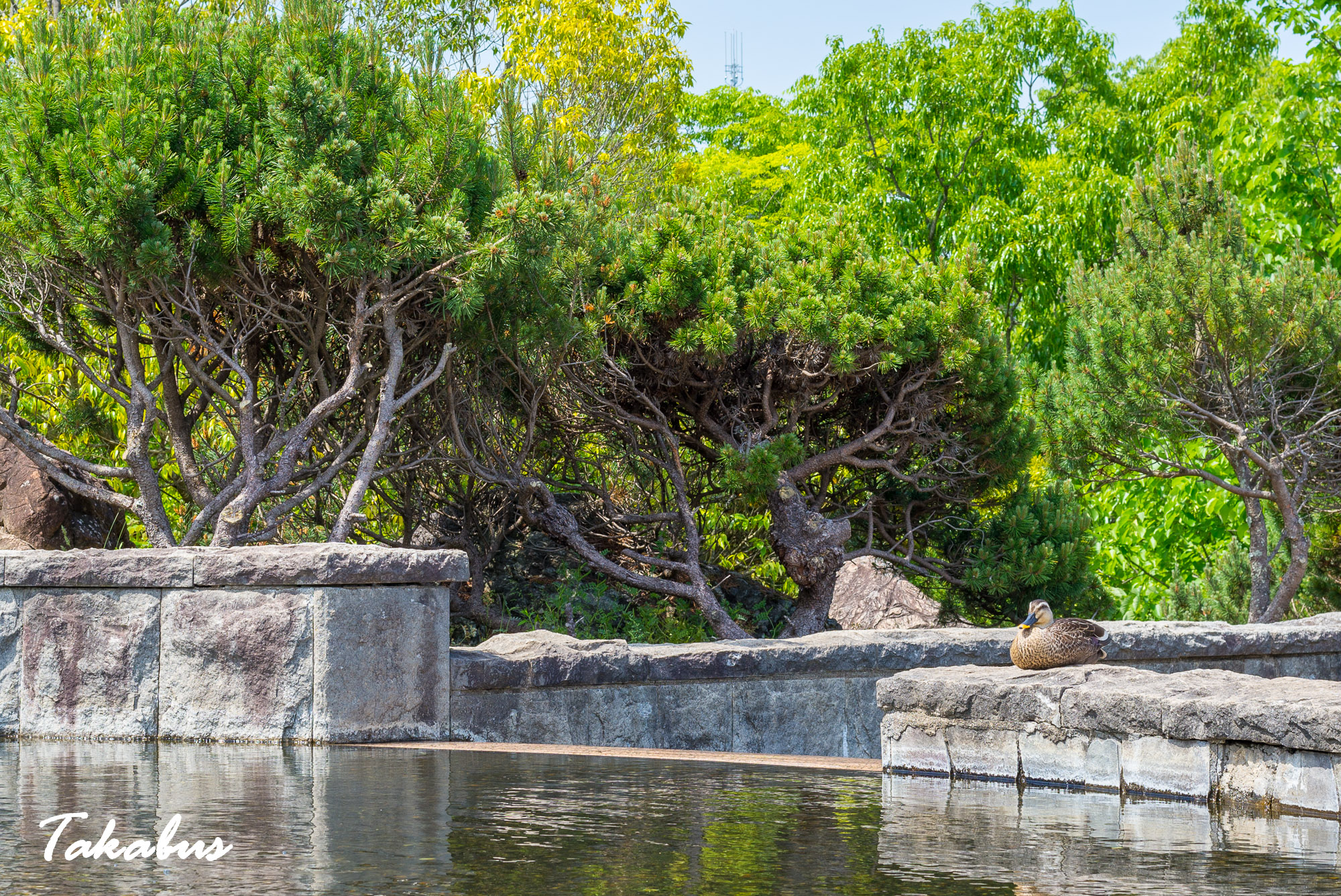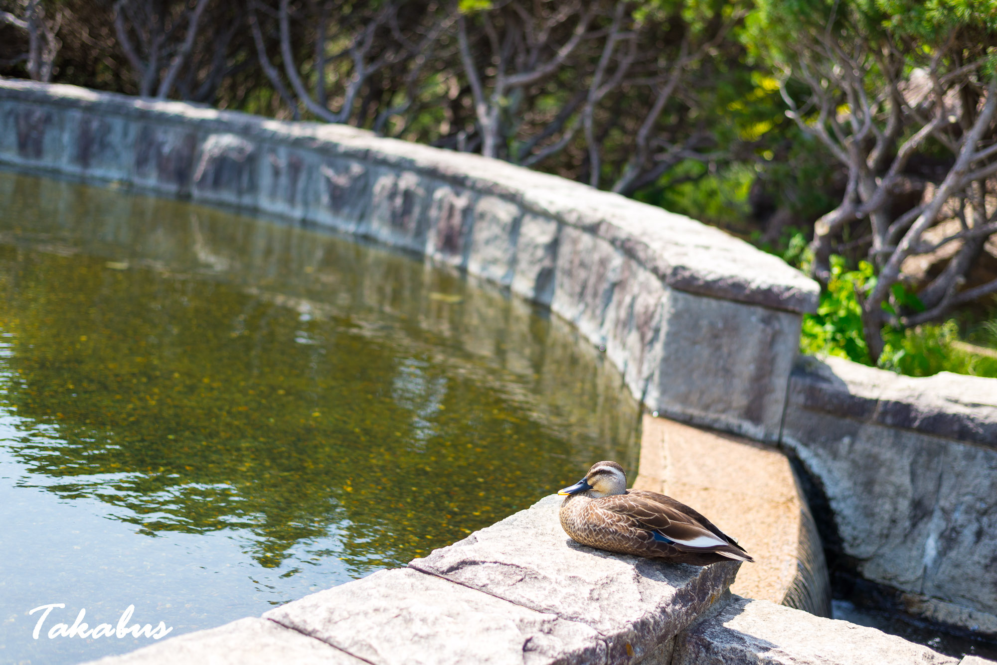 公園の噴水を上ってみると、カモが日光浴をしていた。