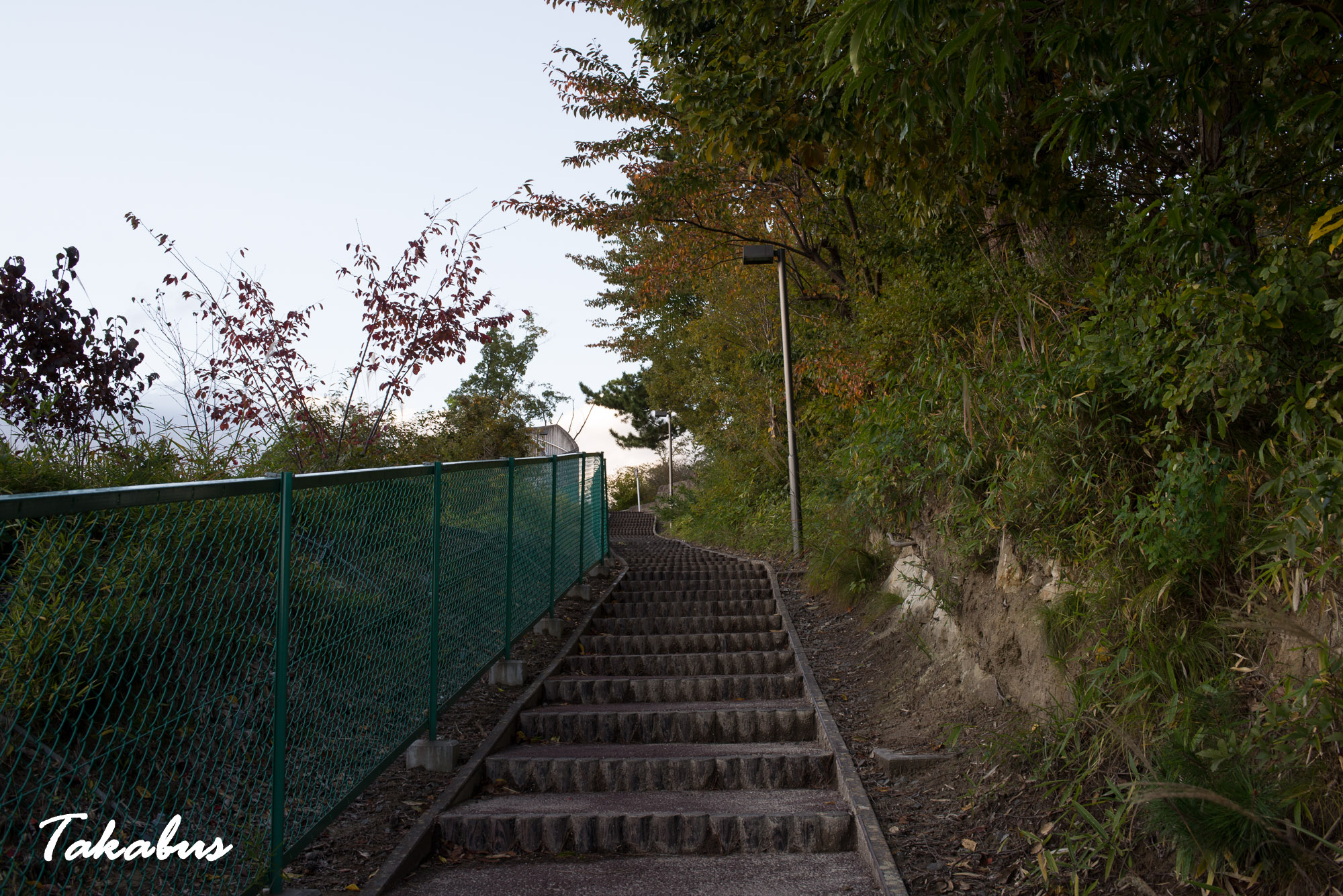 大学のキャンパス内に向かう途中の道から曲がって遊歩道を歩いて行きます。