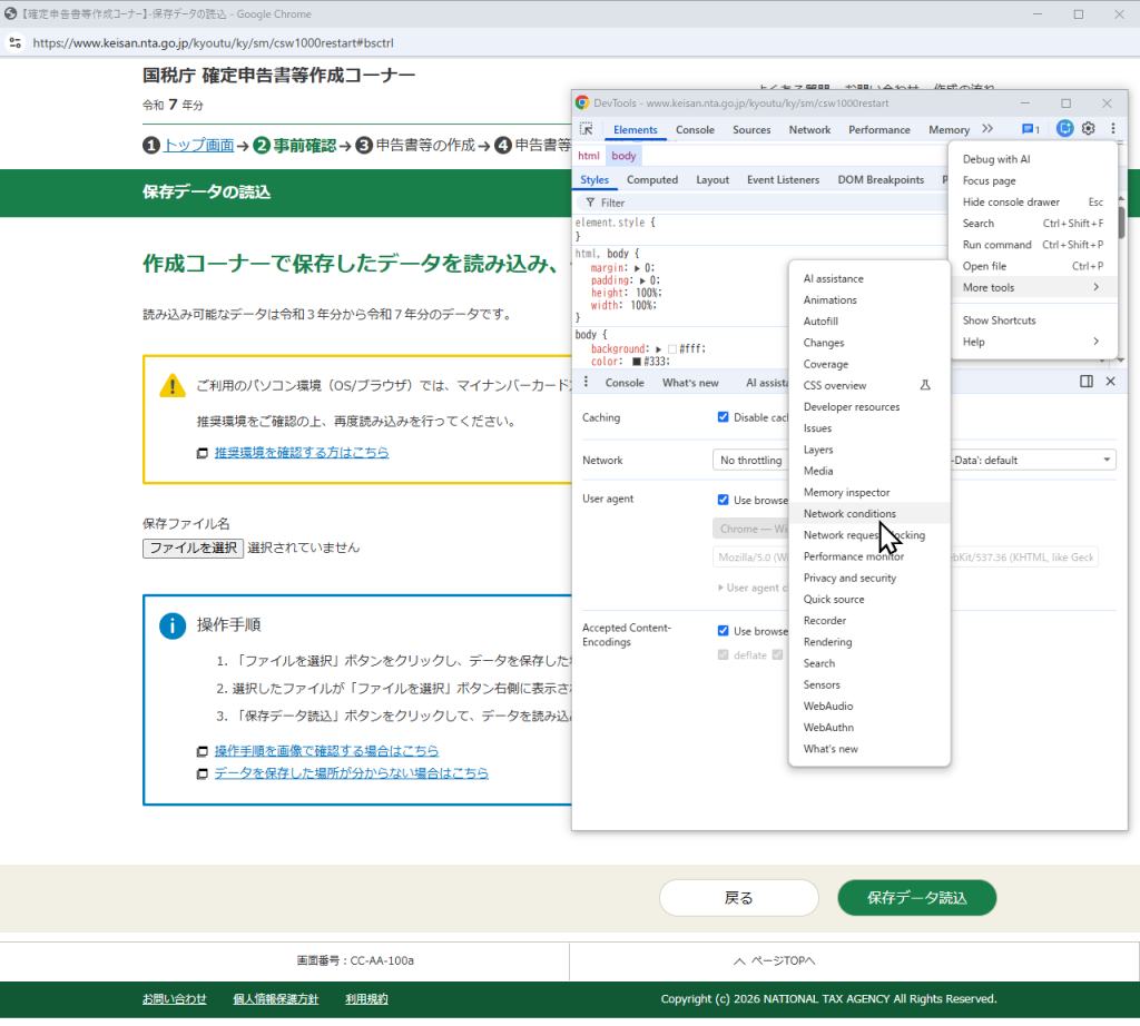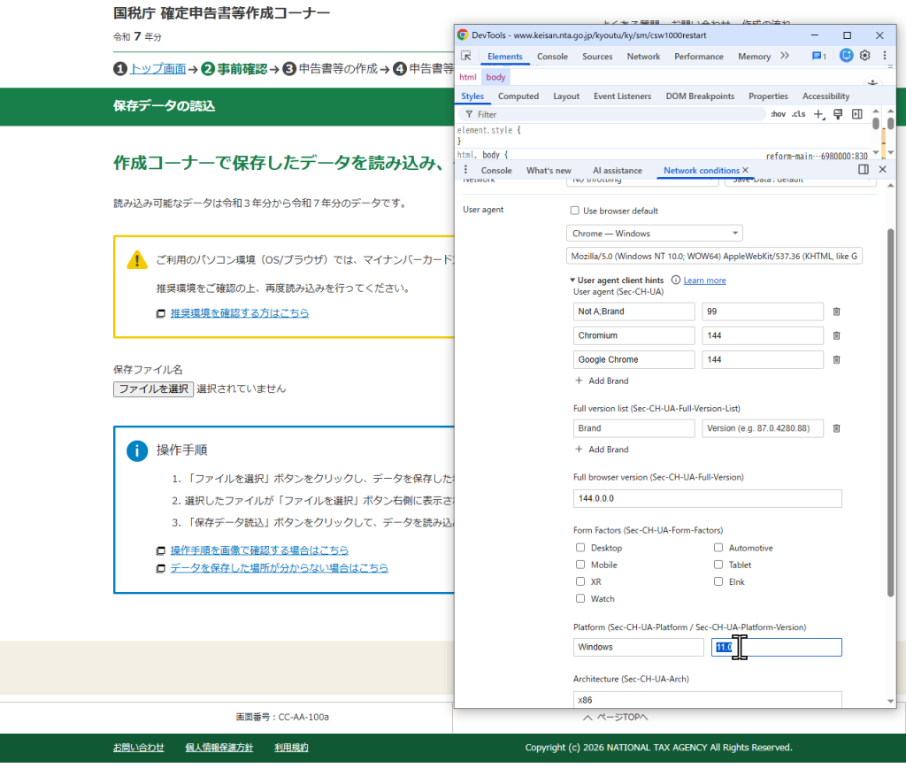 Google ChromeのDevToolを利用して、ブラウザのAgentを変更します。Windows11に見せかけることでデータファイル読み込み時のエラーを回避することができます。