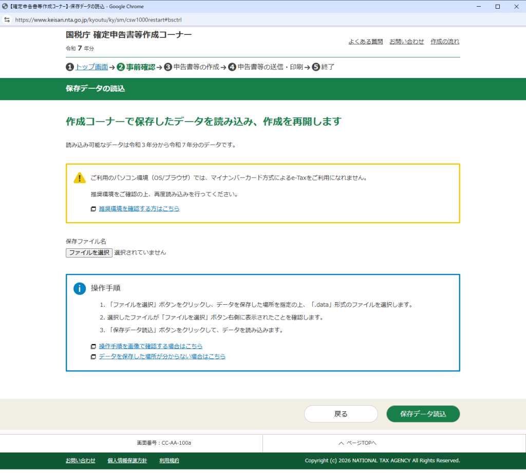 e-Taxでは入力途中の確定申告データをローカルファイルに保存しておくことができますが、Windows10では保存したデータを正常に読み込めないことがあります。