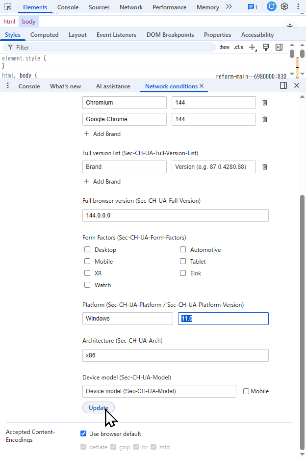 User agentのUse browser defaultのチェックを外し、User agent client hintsを開きます。Platformのところで「10.0」を「11.0」に変更します。
